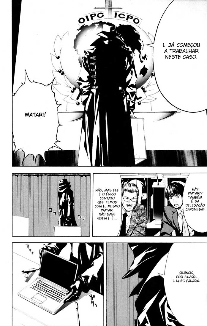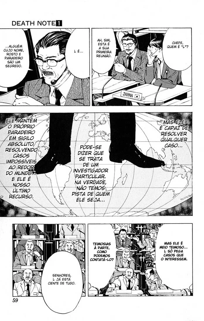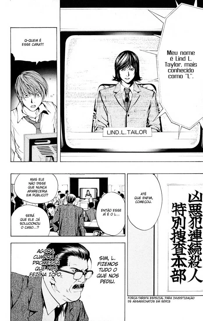 O capítulo começa com a reunião da Interpol vista no capítulo anterior. Representantes da polícia federal de vários países e grandes agências como o FBI e a CIA estavam discutindo sobre as 52 mortes por paradas cardíacas sem explicação durante os últimos cinco dias. Após muito "bate-boca", um dos oficiais de polícia decide que, após todos fazerem comentários de que era impossível pegar esses suposto assassino (apesar de alguns ainda acharem ser coincidência) resolve que a melhor opção é chamar o "L". Todos voltam a discutir e um dos policiais japoneses, Touta Matsuda, pergunta ao seu superior Soichiro Yagami quem seria L. Soichiro explica ao novato que L é o maior detetive do mundo, ao longo do tempo ele foi contratado pela Interpol e outras agências pelo mundo para resolver crimes considerados impossíveis de serem solucionados.