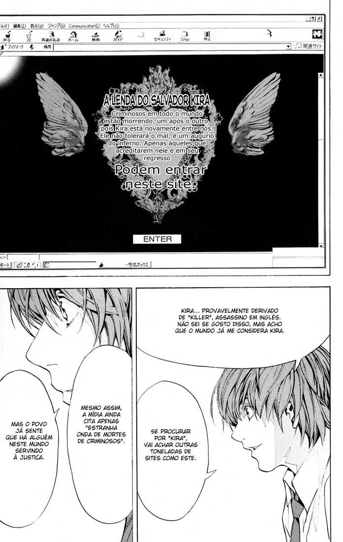 Enquanto isso em outro local, um dia depois da reunião. Light é mostrado voltando da escola com seus amigos (e Ryuk o seguindo, e ninguém além de Light o via) comentando sobre a onda de assassinatos, e que eles, apesarem de sentir um pouco de medo, gostavam e se sentiam aliviados pelo fato de que pessoas ruins estavam morrendo. Então, Light chega em casa e liga seu computador, e acaba caindo em um site que falava sobre "Kira". Light diz a Ryuk que milhares de sites assim estavam aparecendo e que era assim (Kira) que estavam se referindo a "pessoa" ou "entidade" que estava punindo criminosos (apesar da mídia ainda achar que é uma "onda de assassinatos sem sentido"). Light explica a Ryuk que os humanos tentam manter as aparências em público, dizendo que matar pessoas é errado e etc., mas na internet, onde há o anonimato, elas podem expor seus reais pontos de vista, e mostra que na verdade as pessoas estavam o apoiando.