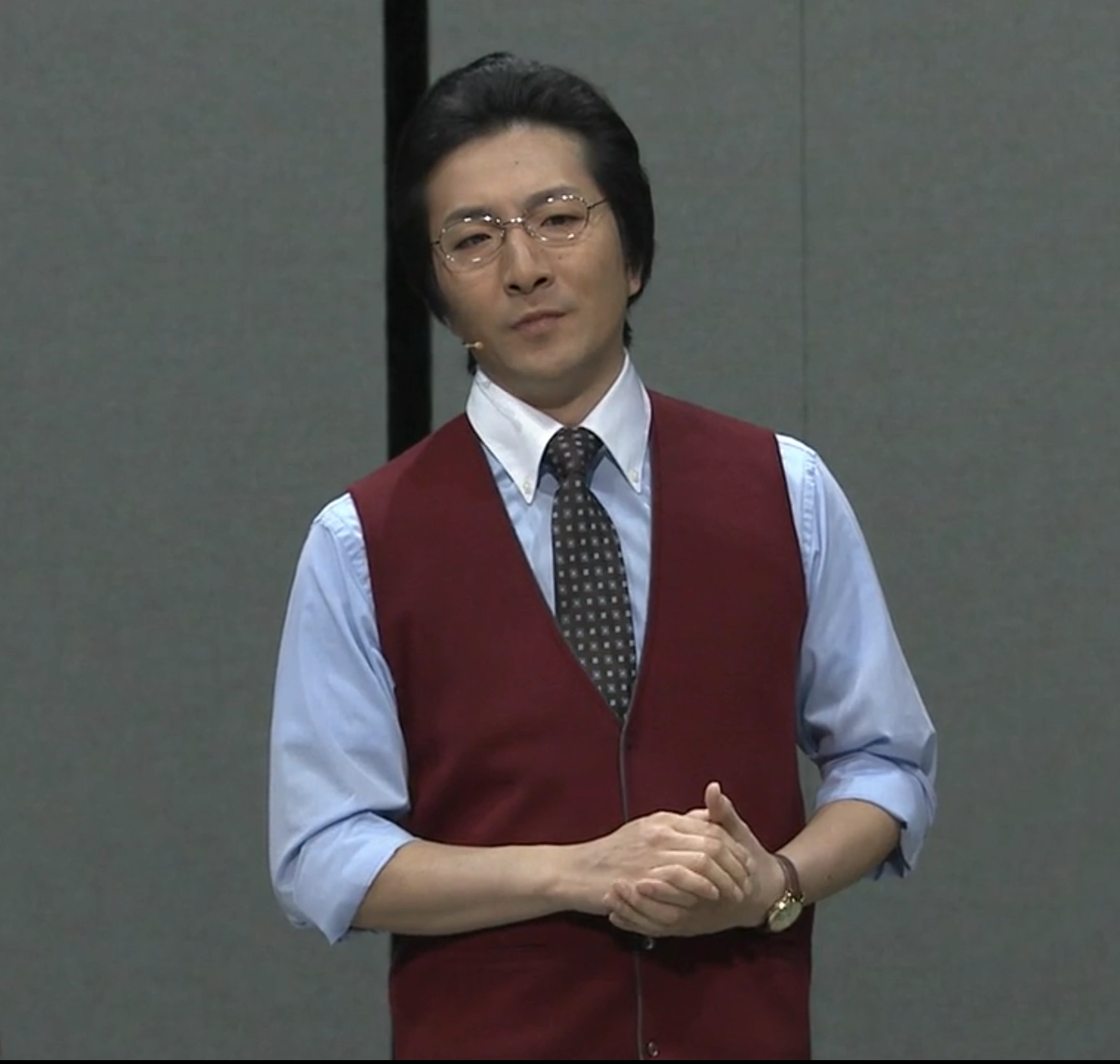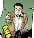 The teacher has fair skin and slightly curly brown hair. He wears a gray suit with a black tie and black-framed glasses with lenses that appear white, blocking out his eyes.