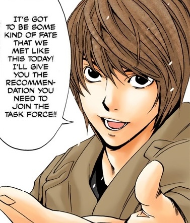 - (To Ryuk, regarding the Death Note) “I've never considered finding that notebook and gaining that power a misfortune.” (Chapter 22)