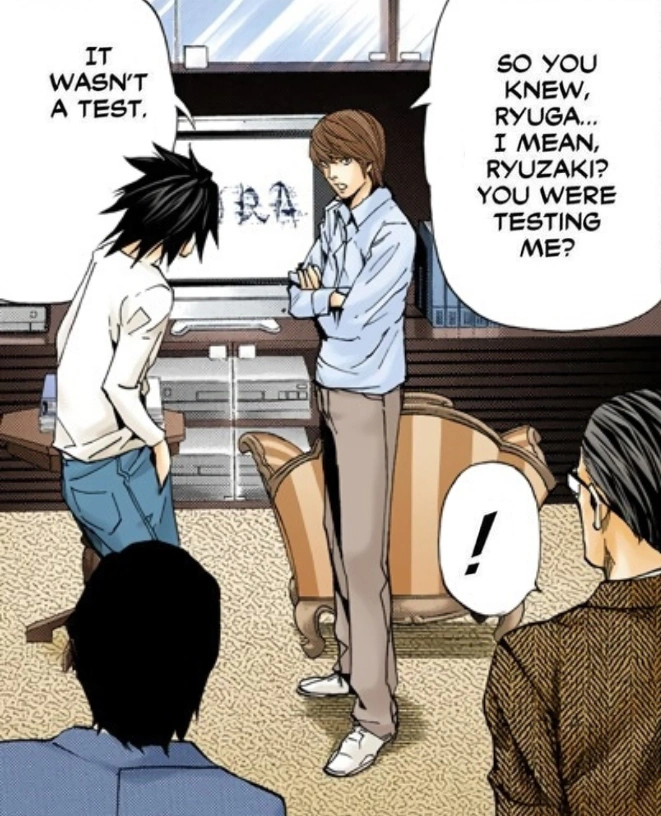 "Hideki Ryuga" then reveals himself to Light as L. Light is shocked by this and is attempting to stay calm around this supposed new friend he's made. When Light arrives home, he throws a tantrum, and explains L's strategy, that should Light write down L's name using the alias even with the off-chance that it's real, the real Hideki Ryuga will die (since Light will have subconsciously pictured Ryuga's face), and suspicion will be pointed towards him. Not only that, but even if Light finds out L's real name, this L could very well be a proxy and suspicion from the hypothetical real L will be pointed towards Light again, as the timing will still be too convenient. Light accepts this challenge from L, getting excited over this upcoming battle of wits.