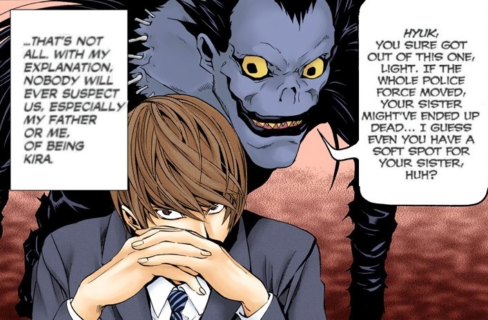 Through the use of the Death Note, Light quickly begins to develop a cold and ruthless nature. As a utilitarian, he will use any means necessary to achieve his goals and ambitions. However, though his actions do put his family in harm’s way, he continues to show love and genuine concern for them. This is demonstrated when his sister Sayu is kidnapped and held for ransom. Light prevents Soichiro from taking drastic action in order to keep Sayu safe, in spite of knowingly increasing Mello's chances of obtaining the Death Note.