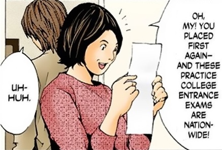 He passes the exams, scoring perfectly, and is able to become a student of To-Oh University. Alongside another student who scored perfectly, who was the student sitting oddly earlier, he gives a speech. Noticing the strange behavior of this student, who named himself after the famous pop idol, Hideki Ryuga, Light feels annoyed at his constant chattering that concerns Light's character.