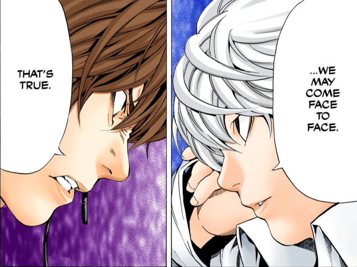 As Light ponders over this, he accepts L's challenge to him. He also declares that he will find L and he will eliminate him. The two announce their intentions, and both declare that they are "justice", with Light needing to avoid suspicion and capture by L all while needing to kill him.