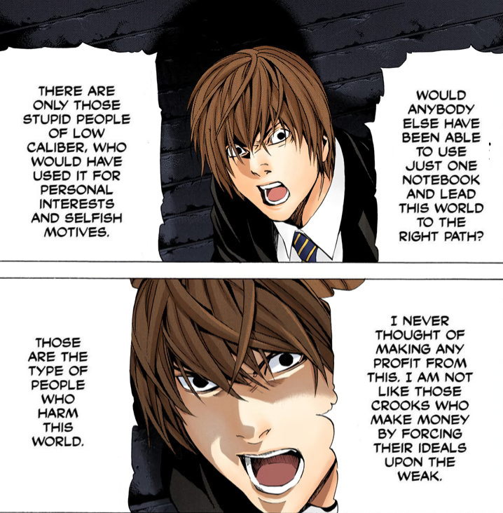- “Under ordinary circumstances, humans should have continued to evolve as the greatest creatures upon this earth. But we were actually regressing... A rotten world. Politics, law, education… Was there anybody around who could correct this world? But someone had to do it. From the moment I got hold of the notebook, I knew that I had to do it.” (Chapter 105)